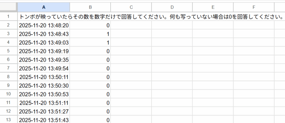 - 用意したGoogleスプレッドシートのA列1行のところにプロンプトを書きます。(例:トンボが映っていたらその数を数字だけで回答してください。何も写っていない場合は0を回答してください。)