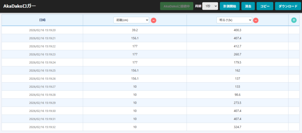 ※カメラ、マイク、MIDIデバイスへのアクセス許可を求めるポップアップが表示された場合は、すべて「許可」を選択してください。 - ステータスが「AkaDakoに接続中」になれば接続成功です。「日時」の横にある選択欄から、計測したい「物理量」を選択できます。また、「+」ボタンで項目を追加、「-」ボタンで項目を削除できます。