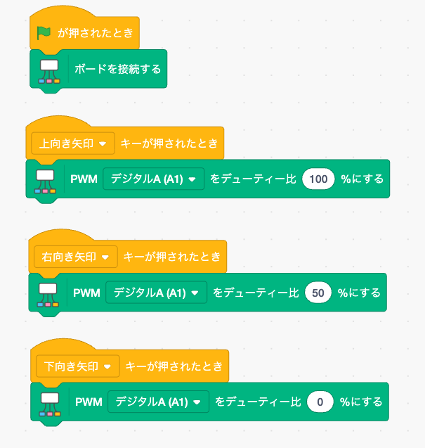 サンプルプログラムのファイルをダウンロードしたら、XcratchもしくはStretch3にアクセスします。"コンピューターから読み込む" をクリックし、ダウンロードしたSB3ファイルを選択して開きます。ファイルを開いたらAkaDakoとPCをUSBケーブルで接続し、センサーやアクチュエーターの動きを確認してみてください。