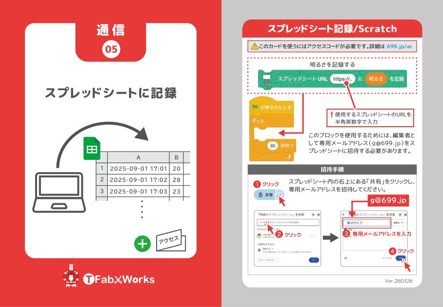 使い方は同梱されているカードの「通信05 スプレッドシート」参照